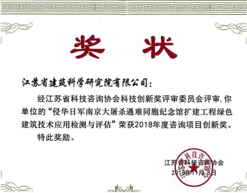 我院承擔的“侵華日軍南京大屠殺遇難同胞紀念館擴建工程綠色建筑技術應用檢測與評估”項目榮獲了2018年度咨詢項目創新獎。