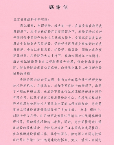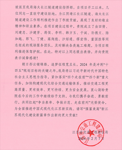 近年來,我院為江陰靖江長江隧道、海太長江隧道等重點工程取得重大進展付出了諸多努力,在龍年春節來臨之際,江蘇省交通工程建設局特別致信,對我院的全力支持表示感謝。