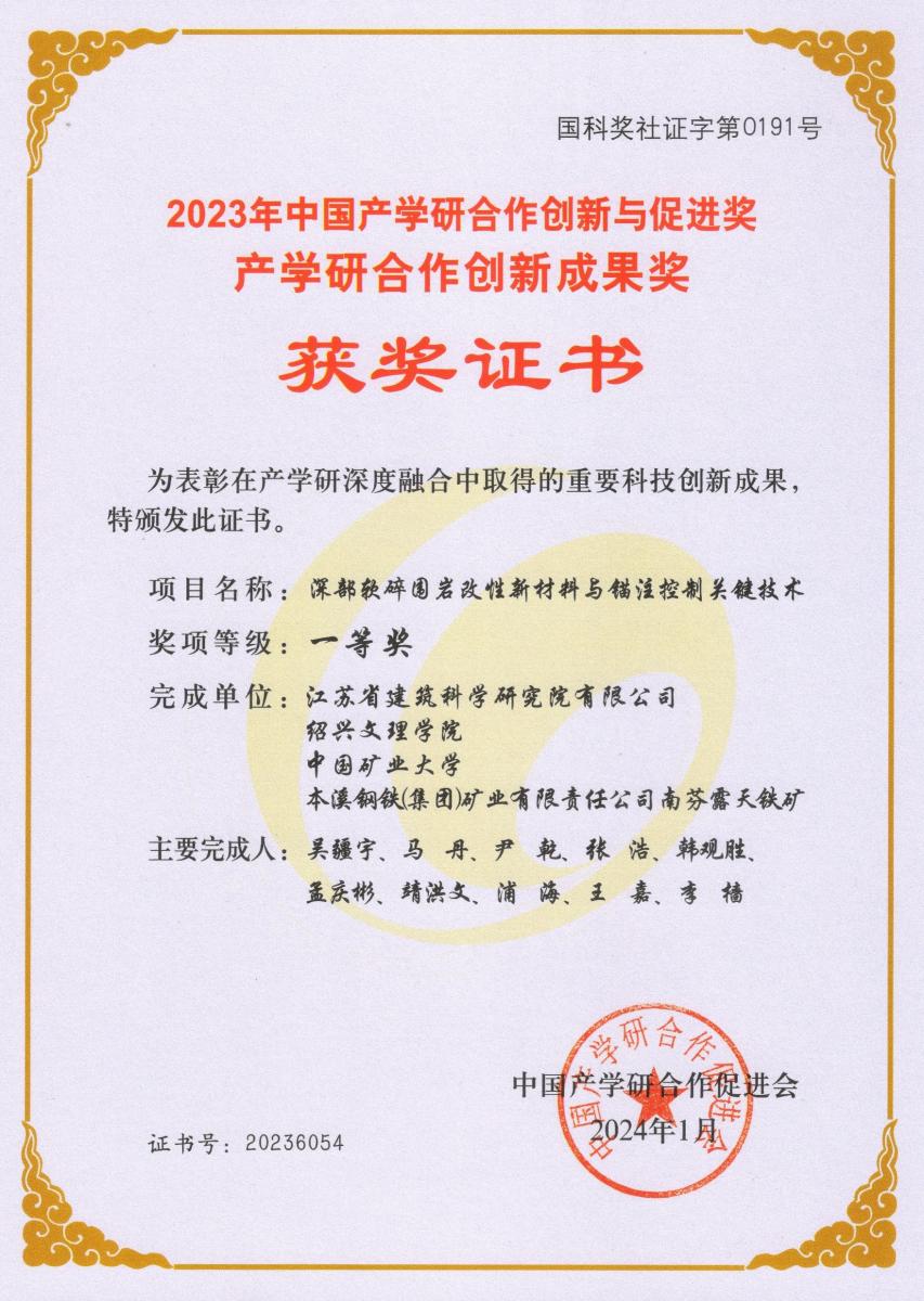 3月17日,第十五屆中國產(chǎn)學(xué)研合作創(chuàng)新大會在京召開。會上表彰了2023年在產(chǎn)學(xué)研合作方面作出貢獻(xiàn)的先進(jìn)單位和個(gè)人,我院博士后吳疆宇牽頭完成的“深部軟碎圍巖改性新材料與錨注控制關(guān)鍵技術(shù)”成果,榮獲2023年中國產(chǎn)學(xué)研合作創(chuàng)新與促進(jìn)獎“產(chǎn)學(xué)研合作創(chuàng)新成果獎”一等獎。